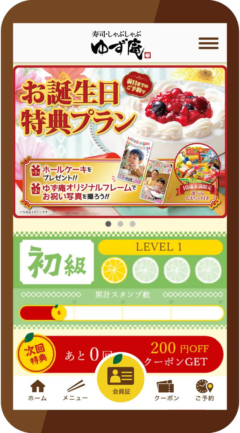 ※来店スタンプ41個目以降は、ランクは維持されますが、クーポン内容は最初の状態になります