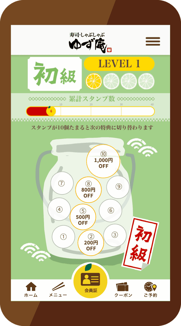 1回来店で1つスタンプがたまります