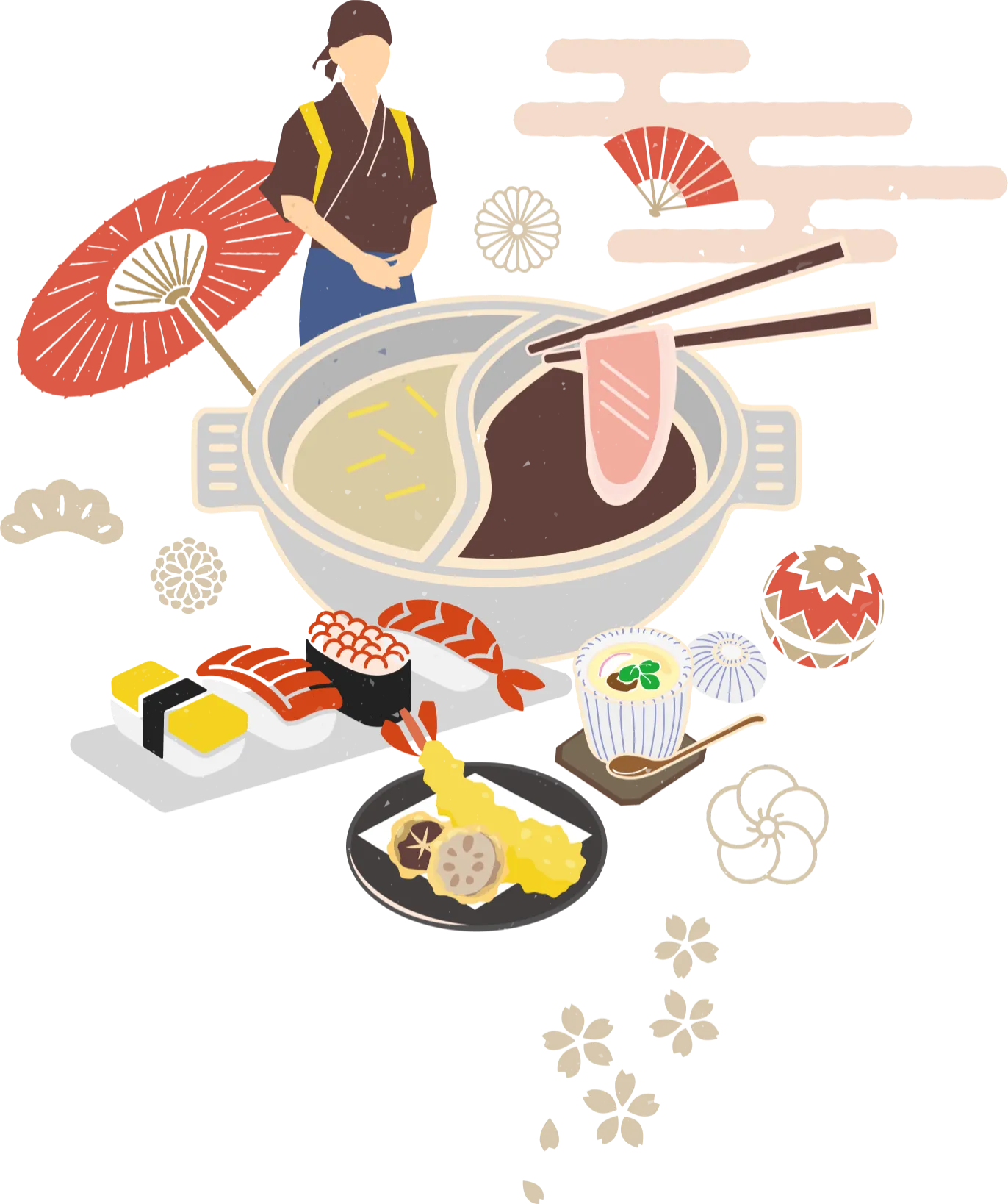 和を代表するお料理、寿司・しゃぶしゃぶ・天ぷらなど、季節の食材を使った、本格和食をご提供します。